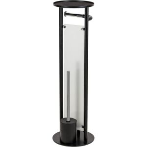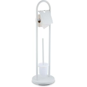 With this elegant toilet roll holder, you always have your toilet paper and toilet brush within reach. The practical shelf provides space for a smartphone, wet wipes, and more. Whether in the bathroom or a guest toilet, this freestanding toilet butler can be flexibly placed without wall mounting. The decorative design of the toilet stand made of natural bamboo and iron fits into any bathroom. The replaceable brush head and removable plastic brush container help maintain hygiene. Toilet Set in Detail - Size H x W x D: approx. 68 x 27 x 18 cm - Weight: approx. 3.2 kg - Material: Iron, bamboo, PP - In various colours Detailed Dimensions of the Bathroom Accessories - Toilet brush length: approx. 36 cm - Brush head H x D: approx. 10 x 8 cm - Internal thread D: approx. 12 mm - Width of toilet roll holder: approx. 13 cm - Shelf W x D: approx. 10 x 13 cm - Spare roll holder H: approx. 31 cm Upright toilet roll holder with toilet brush and shelf - Practical combination of paper and brush