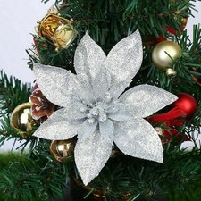 General description These 20cm Silver Poinsettia flowers are perfect for adding a luxurious touch to your Christmas decorations. Made from high-quality velour material with a glitter effect, they enhance the beauty of your Christmas tree, wreath, garland, or any gift decoration. Supplied in a pack of 6, these flowers are designed to make your decorations more attractive and festive. Technical specifications Size: 20cm Material: Velour and net Compatibility and accessories Includes 6 poinsettia flowers with attached metal clips Installation Effortlessly place the poinsettia flowers on your tree using the attached metal clips Clips can be re-glued if detached Usage Ideal for decorating Christmas trees, wreaths, gift boxes, notes, and cards Suitable for wedding parties, birthday parties, New Year's celebrations, photography scenes, and other festive occasions
