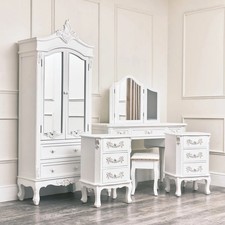 Pays Blanc Range - Furniture Bundle, Antique White Closet, Dressing Table, Mirror, Stool, Chest of Drawers and 2 Bedside Tables. Vintage style white bedroom furniture set, with lots of storage for clothing and accessories. Perfect for an ultimate Shabby chic bedroom look. Made from wood and painted in an antique white crackled glaze and finished with ornate detailing, Some assembley required (please note there is no hanging rail in the closet) This Furniture Range has legs made out of Solid wood (Chinese Fir Wood/Pine Wood and the main body is made out of MDF! Want to view all items within this range? Browse our Pays Blanc Range for more options.The Pays Blanc StoryThe Beautiful Pays Blanc Range Furniture Bundle offers a comprehensive and cohesive solution for those looking to elevate their bedroom decor with timeless elegance. This exquisite bundle includes an Antique White Closet, Dressing Table, Mirror, Stool, Chest of Drawers, and a pair of 3 Drawer Bedside Tables, each piece meticulously crafted to exude a vintage charm. The antique white finish, with its distressed details, adds a touch of rustic sophistication, making it ideal for both classic and contemporary interiors. The closet provides ample storage for clothing and accessories, ensuring your wardrobe is neatly organised. The dressing table, paired with a matching mirror and stool, creates a perfect vanity setup for your daily grooming routine, adding a sense of luxury to your personal space