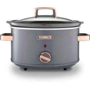 The Tower Cavaletto grey slow cooker features a 3.5 litre capacity cooking pot which is ideal for cooking casseroles, stews and delicious meals for all of the family. Complete with 3 heat settings - Low, High and Warm. Ideal for planning meals ahead of time. The cooking pot is easily removable for cleaning in the dishwasher for convenience. The handles of the slow cooker are made from a cool touch material for easily serving straight to the table. The 3.5 litre grey slow cooker also includes a glass lid, this allows the cooking to be monitored easily without losing any heat producing delicious hot meals. This elegant slow cooker is styled with a grey and rose gold finish which fits perfectly suits and contemporary or modern kitchen. Complete with a 1 year manufacturer's guarantee.