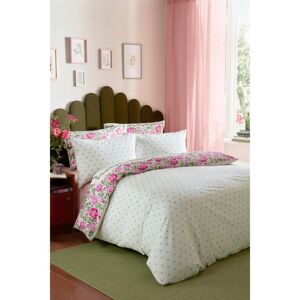 Reimagined from the Cath Kidston Archive, 'Dolly Rose' is a vibrant and joyful hand painted bloom duvet cover set in vibrant pinks and reds. Sitting on a beautiful, soft sage ground, a delicate, heritage rose bud trail frames this timeless design. Printed onto soft 100% cotton percale with ditsy bud reverse. Cath Kidston Size: Double Duvet Cover Set + 2 Standard Pillowcases