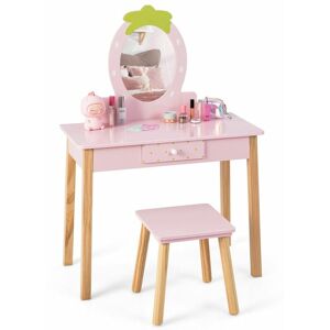 Description: Let kids have an unforgettable childhood with this 2-in-1 kids vanity set! This kids vanity set is designed for versatility with vanity table and writing desk in one. The selected materials, durable MDF and natural pine wood, make the childrens vanity table and stool set long-lasting. Meanwhile, the solid supporting legs and reinforced connections render this kids vanity table and chair set more stable. The large tabletop and practical drawers create space for storage, improving kids hands-on ability. Whats more, the easy-to-clean surface allows you to maintain it conveniently. This childrens vanity set also comes with EN71 certifications for reliable use. Costway 2-in-1 Kids Vanity Set Kids Wood Vanity Table Stool w/ Mirror & 2 Drawers in White