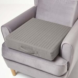 Cotton armchair booster cushion with a removable cover and orthopaedic foam for additional support when sitting. Filled with specially developed orthopaedic foam (33/190) typically used in sofas and chairs, this booster cushion will retain its shape over time and provide lasting support throughout regular use. This specially designed foam is designed to help support the lower back, hips and knees when sitting or standing from an armchair. Ideal for those who are recovering from surgery, the elderly or pregnant women, this booster cushion will help provide support when sitting and can even be used to refresh old and tired armchairs. With a soft 100% cotton quilted removable cover, lined with a thick 170 GSM polyester for added comfort, that zips down two adjacent sides, this cover can easily be removed, washed and the foam re-inserted with ease. Keep this cover clean by washed at home to remove stains and keep your armchairs fresh. These covers can also be removed to mix and match different colours along your sofa for a style makeover. Booster cushions are available as a complete cushion including cover and foam, individual covers are also sold separately. Part of Homescapes booster cushion collection dining chair, two-seater, three-seater and travel cushions are available in a range of colours and sizes. Measures: 50 x 50 x 10 cm. Features carry handle.