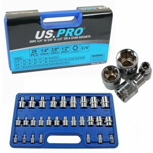 Description - 28pc E Torx Socket Set Brand - US.PRO Drive - 1/4"", 3/8"" and 1/2"" CRV steel construction Polished chrome finish Supplied in sturdy carry case Sizes - 1/4"" Drive - E4, E5, E6, E7, E8, E10, E11 3/8"" Drive - E4, E5, E6, E7, E8, E10, E11, E12, E14, E16, E18, E20 1/2"" Drive - E10, E11, E12, E14, E16, E18, E20, E22, E24