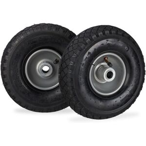 If you find yourself in desperate need of new wheels for your hand truck, these 3.00-4 pneumatic ones are the best choice for you. Even heavy loads can be easily transported using these rubber tyres. Since these lovely pieces with plastic rims are inflatable, they are incredibly shock-absorbent and easy to maneuver. Needle bearings and contoured surfaces facilitate use even on uneven terrain. Inflating is done in a matter of minutes thanks to the car valves. Details per Hand Truck Wheel - Tyre: 3.00-4 - Wheel diameter: app. 26 cm - Wheel width: app. 8.5 cm - Weight: app. 1 kg - Dynamic load capacity: max. 80 kg - Static load capacity: app. 200 kg Handcart Spare Tyre Set - Hub diameter: app. 2.5 cm - Hub length: app. 7.5 cm - Hub diameter: app. 11.5 cm - Material: Rubber, plastic - Various colours available Rubber Wheels Set of 2 - Spare tyres with car valve for inflation - Also great for handcarts, trucks etc. - Easy transport of heavy loads - For easy movement in uneven terrain