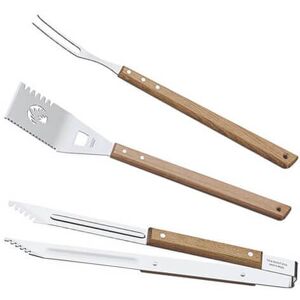 This three piece Tramontina Churrasco barbecue utensil set includes a serrated spatula, tongs and carving fork. Each utensil is made from stainless steel with long riveted wooden handles to keep hands away from the heat of the barbecue. Dishwasher safe. Made in Brazil and supplied with a 5 year Tramontina guarantee.