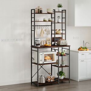 Description: Maximise your living space with this kitchen bakers rack, a sleek and versatile addition to any home. The rich brown wood finish and black metal frame combine for a modern and industrial-inspired look. The rack features a spacious countertop, ideal for meal prep or holding small kitchen appliances. Nine open shelves provide ample room for plates, jars, and other kitchenware. A metal basket offers extra storage for utensils or small items. What truly sets it apart is the built-in power sockets, complete with two standard outlets and two USB ports. This convenient feature allows you to easily power small kitchen appliances or charge your devices while you cook. Perfect for use as a kitchen organiser, home bar, or stylish storage solution for any room. Features: *[Premium Materials]: Crafted with a durable steel frame and sturdy wooden shelves, ensuring long-lasting performance and strength. *[Durable Construction]: The sturdy metal X-frame ensures stability, providing a