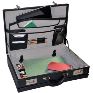 This Monolith leather look expanding attache case features a full organiser section in the lid with a dedicated tablet pocket. The case also features a soft flock lining with a business card pocket, pen holders and a mobile phone pocket. This black case features metal combination locks and fittings, and measures W440 x D100 x H310mm.