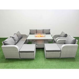 Important: Please put the gas fire pit on the glass top not under the glass .Do not cover the igniter with lava .please refer to the picture in the listing. we strongly recommend using 5 kg gas tank. Before using the fire pit ,please check it carefully if there is any leakage at the joint place or the hose . if the gas bottle is not fixed correctly or the hose has some leakage it may cause danger . Pls kindly leave your mobile number at checkout for not delaying your shipment . Set dimensions: • 2 x Reclining chairs Size: 74W x 69D x 79H cm • 2 x 3 Seater Sofa Size: 177W x 67D x 79H cm •2 x Big footstool :65L x 65W x 34H cm • 1 x Firepit Dining Table Size: 140L x 80W x 69H cm • Sofa Weight Capacity: 250kg • Table Weight Capacity: 80kg Light grey rattan with dark grey fabric .Color may vary due to light or monitor .we are unable to return the item due to this problem .Please contact us before purchase if you have requirements on color saturation . The 2 armchairs are adjustable, you
