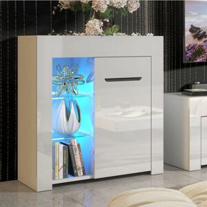 The cabinet features a high gloss white finish to the front (including door and front panels) with the rest of the body (top, sides and inside) in a matt white finish and a stylish graphite grey inner handle. The cabinet features an open display area with two glass shelves as well as a cupboard with a wooden shelf for storage Dimensions: (WxHxD): 75x83x35cm Blue LED lights are included (2 LED clips + UK Power adapter), they are mains powered with a UK power adapter and foot switch to turn them on and off. Note that this is a flatpack item and will require assembly. Picture instructions, and a written notice are included with the item, these should be looked over carefully, before attempting assembly.The item is supplied flat packed in one parcel.