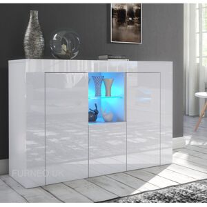 The item features a high gloss white finish to the front (including doors and front panels) with the rest of the body (top, sides and inside) in a matt white finish. The cabinet has three doors. Two doors use a push to open mechanism with a single shelf behind each, the middle cupboard door elevates slightly above the middle shelf for opening, with a glass shelf in the upper open space. Blue LED lights are included, they are mains powered with a UK power adapter. The foot switch is used to turn them on and off. Note that this is a flatpack item and will require assembly. Picture instructions, and a written notice are included with the item, these should be looked over carefully, before attempting assembly. Furneo