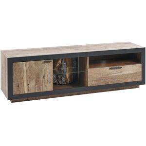 Cabinet with 2 Drawers for a TV up to 55ʺ. To make your living room complete, you'll need a proper storage furniture - and it's the best to get both a functional piece, and a decorative one, just like this TV stand. The piece features a trendy, rustic look and comes with plenty of storage space - there are 2 display shelves and 2 capacious drawers. On its curved sides there are doors, behind which there are additional shelves. If you decide to place a TV on the sideboard, or other electrical piece, you'll be able to organize the cables thanks to special holes on its back. The stand doesn't require daily maintenance as it is made out of high-quality MDF. Details: Product Type: TV Stand Style: Rustic General Color: Black, Brown Material Type: Engineered Wood Main Material: MDF Legs material: Engineered Wood Top Material: Engineered Wood Shelves number: 4 Doors Opening: Standard Drawers: Yes Finish: Melamine Number of Doors: 2 Number of Drawers: 2 Dimensions: Depth: 40 cm Width: 160 cm