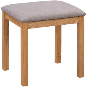 This is the ideal complementing feature to the Hereford Oak Dressing table and fits perfectly in any room with a light or neutral palette, theme or decor, due to the light grey and golden hues, which are enhanced by the gloss finish from the natural lacquer coating. This coating also serves to protect the surface of the light oak and panelling from light knocks, bumps and scratches. The grey fabric seat and the sturdy, solid oak frame lend durability and peace-of-mind, for a staple piece of bedroom furniture, which will remain useful and reliable for generations. Features Padded seat for extra comfort. Solid oak frame for durability and peace-of-mind. Easy to store neatly away when not in use. Assembly: Legs need fixing Material: Solid oak with padded seat Finish: Lacquered Colour: Light Oak Height: 45cm Width: 45cm Length: 37cm