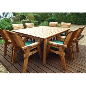 This solid wood eight seat outdoor dining set includes 8x armchairs, a large square table, 8x waterproof seat cushions, a cushion storage, a 2.7m parasol and a parasol base Union Rustic Cushion Colour: Green