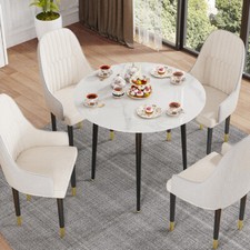 General description This round kitchen dining table combines modern mid-century appeal with contemporary sophistication. Featuring a sintered stone top and a plywood baseplate, it is supported by a sleek pedestal base, ensuring durability and ease of maintenance. This table can be paired with upholstered chairs for a cozy atmosphere or velvet seating for a more opulent look, making it a striking statement piece in any setting. Technical specifications Type: Dining Table Shape: Round Circle Materials: Metal Iron, Sintered Stone, Plywood, Aluminum Color: Jade White & Black Net Weight: 15.4 kg / 33.95 lbs Weight Capacity: 30 kg / 66.14 lbs Product Dimensions: 76.5 cm (L) x 80 cm (H) / 30.12 inch x 31.50 inch Other information Package includes: 1 x Round Dining Table, 1 x Screw Accessory, 1 x Instruction Guide Note: Tiny measuring errors are allowable within a normal range. Color may vary slightly due to monitor or camera settings; please refer to the physical item.