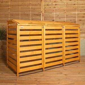 Relax and enjoy your outdoor leisure time in the garden this year without the unpleasant sight of your wheelie bins. With 3 attractive, curved opening lids this triple bin store is designed to neatly hide away and cover up three standard size wheelie bins. Featuring practical top hinged lids and side hinged front doors for easy access. Each top hinged lid includes a securing chain that can be attached to the bin lid allowing the lid off the bin to open when you lift the storage lid. The chain is attached by threading it through the handle of the bin lid and then attaching it to the store lid and can be easily removed when it's bin day. The natural wooden frame will compliment any garden and outdoor setting and the slatted design helps promote air flow and maintain a clean area. The wood is ACQ treated for durability and longevity. Supplied flat packed and self assembly is required. Product Dimensions External dimensions: 199m wide, 125cm high at the back, 113cm at front. Internal Dimension: Load space 64cm wide, 122cm high, 79cm front to back Takes up to 3 x 240 litre bins. Samuel Alexander 1.99m x 1.25m Large Wooden Outdoor Garden Triple Wheelie Bin Store Storage for 3 Bins in Brown
