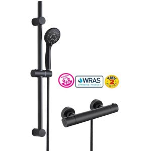 This high quality solid brass WRAS TMV2 approved thermostatic exposed shower mixer in a stylish black matte finish. This thermostatic shower mixer bar valve allows you to halt or control the flow of your shower whilst the thermostatic control gives complete temperature performance, suitable for any modern bathroom. Works on all conventional plumbing systems (min pressure 0.5 Bar). With its ultra clean lines and minimalist styling, This Matte Black mixer shower is more than a shower. It s a statement. Your statement. Whether you re out to enhance a coloured interior, or complement your very own oasis of calm, this shower will help you reflect just the right mood. Using WRAS approved showers offer you the peace of mind that every component in the shower has been rigorously tested to meet the highest quality standards. You can find more information by visiting the WRAS website Includes a matching shower riser rail, shower hose and shower head. Supplied with a 10 Year Guarantee for Peace