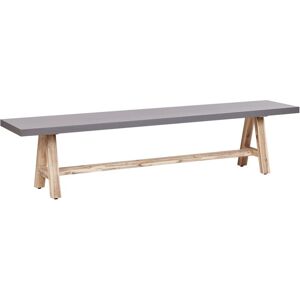 Concrete Outdoor Bench with Wooden Legs. This garden bench features a smooth, solid concrete seat paired with sturdy legs crafted from acacia wood. The combination of grey concrete and light wooden tones creates a contemporary look that suits various outdoor settings. The bench is designed for durability and comfort, providing a stylish yet functional seating space you can enjoy for many years. Details: Product Type: Bench Style: Industrial General Color: Grey, Brown Material Type: Concrete Main Material: Fibre Cement Additional Material: Acacia Wood Finish: Laminated Seats Up To: 3 People Dimensions: Depth: 40 cm Seat Height: 45 cm Width: 200 cm Height: 45 cm Seating Surface: 200x40 cm Weight: 30 kg Weight Capacity per Person: 150 kg Offer Includes: 1 x Bench Key Features: Concrete Finish for Industrial Look, Timeless Design, Modern Look and Quality for Many Years, Sturdy Frame Construction, Solid Craftship Assembly Information: Full Assembly Required. 5-15 min. Additional