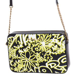 Michael Kors crossbody bag black/optical white/neon yellow "Grafitti" Canvas with printed coating and smooth black leather Gold tone top zipper closure. Black leather strap and gold-tone chain link. Interior: 2 open interior pockets. Measures: 25cm (W) x 17cm (H) x 5cm (D) Composition: 100% Leather Care: Clean with a wet cloth.