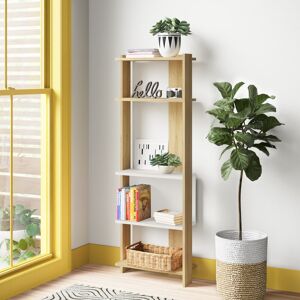 This bookcase's contemporary design features an open build and gently geometric structure, available in a range of colors and sizes to suit your existing décor. The bookcase features four shelves ideal for displaying not just books but photographs, records, electronics, art, houseplants, and more. Assembly is required. Zipcode Design Size: 165cm H x 59cm W x 26cm D, Colour: White/Anthracite
