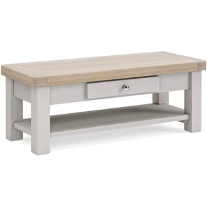 This elegant coffee table combines style and practicality, featuring a sturdy construction with chunky tops and legs for a robust and durable structure. The natural oak-finished tabletop adds a rustic charm, while the grey painted finish offers a sophisticated, contemporary look. The 120cm wide surface provides ample space for drinks, books, or décor items, making it a perfect centerpiece for your living room. The table includes a single drawer for hidden storage, ideal for keeping remote controls, coasters, or other small items out of sight. The unit also comes with interchangeable handles—either antique black or polished silver—allowing you to customize it to suit your personal style. The oak top is protected with a whitewash oil to enhance the wood grain, ensuring both beauty and durability. Lark Manor