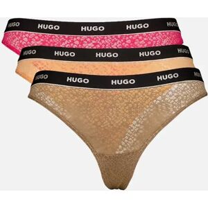 Stunning 3-pack of HUGO Women's Classic Logo Thongs, in Bright Pink, Apricot Orange, and Earthy Brown, each with contrasting black waistbands, and crafted in Beautiful Lace Item is Non Returnable due to Hygiene reasons Features Signature HUGO Elasticated Logo Waistband Microfibre Stretch fabric ensures a comfortable fit Fabric Composition: 90% Polyamide / 10% Elastane MPN: 50535265-960 Our collection at Boxers and Briefs contains only the highest quality HUGO BOSS Womens Underwear. One of our most popular ranges is the HUGO Triplet Underwear collection. A three-pack of regular-rise thongs by HUGO. Ideal for wearing under form-fitting outfits to create a smooth outline, these stretch lace thongs are topped with logo waistbands for signature edge. HUGO Women's Thongs Size Guide: X-Small (UK Size 6), Small (UK Size 8), Medium (UK Size 10), Large (UK Size 12), X-Large (UK Size 14), XX-Large (UK Size 16) & XXX-Large (UK Size 18).
