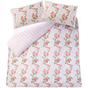 Made for dreamers, the beautiful Rose flutter bedlinen is a modern take on a traditional classic. Hand painted Roses dance amongst delicate foliage alongside a hand-painted ditsy wiggle which is contrasted with a bold, candy stripe. Printed onto soft 100% cotton percale in a dreamy palette of pale plaster pink, coral shades, and a vibrant green leaf. Cath Kidston Size: Full Duvet Cover + 2 Pillowcases
