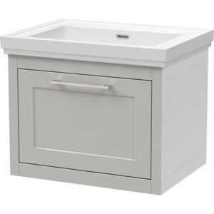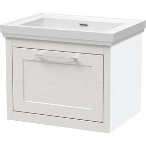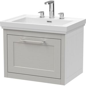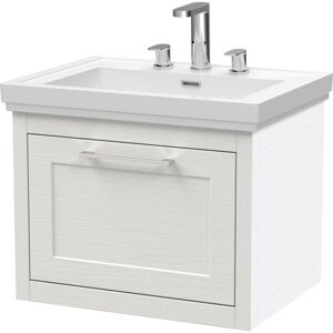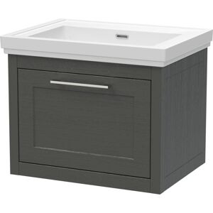 Traditional Bathroom Wall Hung 1 Drawer Vanity Unit and 3 Tap Hole Fireclay Basin, 600mm, Woodgrain Dark Grey Blending timeless shaker styling with contemporary elegance, this vanity brings a calm, curated feel to your bathroom space. Its wall-mounted design enhances the sense of space, while thoughtful storage keeps life beautifully organised. Crafted from high-quality materials, this unit features a premium fireclay basin and a durable, white wood grain finish built to withstand daily use. Soft-close functionality and fully assembled construction reflect a commitment to long-lasting craftsmanship. Product Highlights: STYLE: Contemporary classic shaker styling in a dark grey wood grain finish delivers bold elegance and depth—perfect for creating a statement look that balances modern sophistication with timeless appeal in any bathroom setting. FIRECLAY BASIN: A beautiful blend of strength and style—this premium fireclay basin resists stains and scratches, offering a smooth, easy-clean