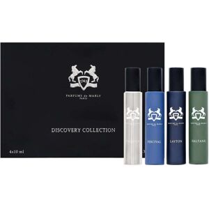 Parfums de Marly celebrates 18th-century luxury with this masculine discovery set of four 10ml Eau de Parfum sprays. Perfect for travel or trying signature fragrances, the set includes: Pegasus — an amber-fougère with cumin, heliotrope and bergamot, a lavender and bitter almond heart and a sandalwood, vanilla and amber base; Percival — a fresh citrus-aromatic blend of bergamot, mandarin and pink pepper with lavender, geranium, cardamom and a balsam fir, tonka and woods base; Layton — an amber-aromatic accord of bergamot, apple and lavender with violet, geranium and jasmine heart and a spicy woody base of oud, patchouli, sandalwood, vanilla, pepper and cardamom; Haltane — a contrast of clean freshness and robust woods with bergamot, lavender, clary sage, saffron, cedar, praline, oudwood and a dry finish of patchouli, vetiver, musk, leather and agarwood.
