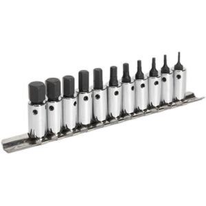 Sealey Premier Lock-On™ Hex Socket Bit Set 1/4" & 3/8"Sq Drive 8pc Features: Professional heat treated Chrome Vanadium steel sockets. S2 Steel hex bits with a zinc phosphate finish. Removes rusted, damaged and severely rounded hex head fasteners with ease. Patented twist design grips tighter as they turn preventing fasteners from rounding. Supplied on a metal socket rail. Technical Details: • Professional heat treated Chrome Vanadium steel sockets. • S2 Steel hex bits with a zinc phosphate finish. • Removes rusted, damaged and severely rounded hex head fasteners with ease. • Patented twist design grips tighter as they turn. • Prevents fasteners from rounding. • Sizes: 1/4"Sq Drive; 3-6mm, 3/8"Sq Drive; 7-10mm. • Supplied on a metal socket rail. • Lifetime guarantee*. • Model No. AK65600 • Model No. AK65600 Additional Information: • One of a comprehensive range of Premier Hand Tools, suitable for daily professional use. • Professional heat treated Chrome Vanadium steel sockets. • S2