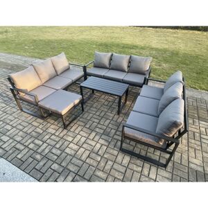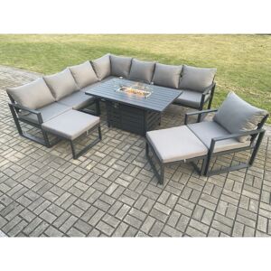 This aluminum gas fire pit sofa dining set can accommodate 10 peoples and has a comfortable and soft cushion back, being made of high quality Alloy aluminum and durable powder coating for sturdiness and structural durability. that will withstand our British weather of rain, wind and sun. The cushions are premium quality, super thick, with washable covers. Important notice: Please Do not cover the igniter with lava .we strongly recommend using 5 kg gas tank. Before using the fire pit ,please check it carefully if there is any leakage at the joint place or the hose . if the gas bottle is not fixed correctly or the hose has some leakage it may cause danger . Set Dimensions: • 3 x 3 Seater Sofa: 166W x 73D x 78H cm • 1 x Side coffee table :68L x 68W x 59H cm • 1 x Big footstool :60L x 60W x 35H cm • 1 x PC dining table with fire pit: 140L x 80W x 70H cm (Aluminum table top Without glass) Dark grey powder coated with dark grey fabric .Color may vary little due to light or monitor .we are