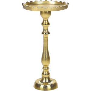 Round End Table. Add a glamorous feel to your interior with this accent side table. The tray-shaped top can be used as a spot for afternoon tea or a place for decorations display. The ornamental leg of the piece and the glossy finish in gold create the upscale feel of the furniture. Details: Product Type: Side Table Style: Glam General Color: Gold Material Type: Metal Main Material: Aluminium Legs material: Metal Top Material: Metal Shape: Round Finish: Lacquered Storage: No Dimensions: Width: 35 cm Length: 35 cm Height: 66 cm Weight: 3 kg Weight Capacity: 20 kg Offer Includes: 1 x Coffee Table Key Features: Modern Design, Decorative Yet Functional, Works Great with Many Interior Styles, Stable and Durable Construction, Unique Handmade Piece, Exceptionally Easy Care Assembly Information: Partial Assembly Required. 5-15 min. Additional Information: Each product of this model is hand-made and unique, therefore the shade and pattern may be slightly different from the model presented in