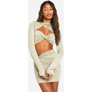 Striking two-piece co-ord set featuring a long-sleeved top and mini skirt Unique twist-knot design on both the top and skirt for added intrigue Daring cut-out detail on the top showcases a hint of midriff Figure-hugging silhouette accentuates curves Versatile slinky fabric offers comfort and style Make a bold statement with this eye-catching co-ord set, perfect for those nights out when you want to turn heads. The long-sleeved top features a crew neckline and an alluring cut-out detail, complemented by a twist-knot design that adds a touch of sophistication. Paired with a matching mini skirt, this ensemble creates a sleek, cohesive look that's sure to impress. For a night at the club, style with strappy heels and statement earrings to amplify the glamour. When meeting friends for drinks, throw on a leather jacket for an edgy twist. The slinky fabric ensures you'll stay comfortable while dancing the night away or sipping cocktails at a trendy bar. This versatile set can be dressed up or down, making it a must-have addition to your going-out wardrobe.