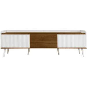 Use our stylish TV cabinet to display your television and store your small items. The three-door design offers ample storage space to meet your needs, while the combination of white and wood creates a soft and warm feeling. The top of the TV cabinet features a raised edge to prevent collision damage and items from slipping—ideal for households with children and pets. Wooden legs provide stability. The versatile design is perfect for your living room. The carefully crafted, raised, striped cabinet doors add a touch of elegance and a unique style to your interior. Complete your collection with this TV cabinet and enjoy it for years to come. Product Features: This stylish TV unit features three contrasting doors and a spacious interior, offering plenty of storage space and easy access. Made from high-quality materials, this TV unit is especially durable. Solid wood legs provide strong support and stability. Durable E1-grade particleboard ensures long-lasting use, making it an ideal