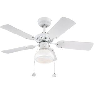 Dimensions and technical details 220-240 V ~ 50 Hz Diameter: 90cm / 36" Housing colour: white Blade colour: beech / white (reversible) Blade pitch: 18° Lighting: use 1 x E27 base, max. 60 W (bulb not included in the delivery) Motor wattage: 26 / 37 / 53 Revolutions per minute: 130 / 195 / 271 Max. airflow: 104 m3/min / 3672 CFM Max. noise level: 48 dB(A) Ceiling to blades: 22cm / 8.6" Ceiling to bottom of light kit: 44cm / 17.3" Diameter canopy: 13cm / 5.1" Max. ceiling slope: 18° Manual reversing switch for summer and winter mode on the housing Independent pull cords for light and fan: light on / off, 3 fan speeds / off Weight: 4.9kg / 10.8lbs