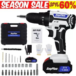 Package Contents: 1 x Cordless Drill 2x 1500mAh Li-ion Batteries 1 x Fast Charger 1 x User Manual 1 x Carry Case Some Accessories (please see the picture) 21VCordless DrillDriver Combi Rechargeable Lithium-Ion 1.5A Screwdriver LED Worklight ,Fast ChargerHeavy Duty Power Tool Set . Features: 2 Speed Transmission for Screw Driving and Drilling -Low speed(gear 1) for great torque, suitable for screwing big bits. -High speed(gear 2) for small torque, appropriate for fast screwing. 25+1 Position with Clutch to Prevent Stripped Screws -25 gear of torque with clutch to protect screws; 1 gear of drill is deal for drilling. -LED indicator shows real-time capacity of power of battery, reminding you of low power and charging. Ergonomic Handle Delivers Comfort and Control -Good vents on the sides that dissipate heat and do not let your hands become sweaty. -Li-Ion Battery more than 300 times Circle life -Our Drill / Driver kit is great for a variety of home projects, with its Lithium-Ion battery,