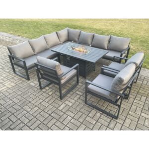 This aluminum gas fire pit sofa dining set can accommodate 10 peoples and has a comfortable and soft cushion back, being made of high quality Alloy aluminum and durable powder coating for sturdiness and structural durability. that will withstand our British weather of rain, wind and sun. The cushions are premium quality, super thick, with washable covers. Important notice: Please Do not cover the igniter with lava .we strongly recommend using 5 kg gas tank. Before using the fire pit ,please check it carefully if there is any leakage at the joint place or the hose . if the gas bottle is not fixed correctly or the hose has some leakage it may cause danger . Set Dimensions: • 1 x Left Sofa with single armrest: 125W x 70D x 78H cm • 1 x Right Sofa with single armrest: 125W x 70D x 78H cm • 1 x Corner Sofa:70L x 70W x 78H cm • 2 x Armless Sofa Size: 60L x 70W x 78H CM • 3 x Chair Size: 74L x 70W x 78H CM • 1 x Dining table with fire pit: 140L x 80W x 70H cm (Aluminum table top Without