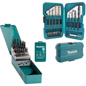 Makita D-54097 25 Piece Drill Bit HSS-R Metal Drill Bit Set Storage Tin 1-13mm Highly efficient HSS-R drill bits suitable for drilling applications in steel and cast-steel alloyed and unalloyed up to 900N/mm tensile strength, grey cast,malleable cast iron, die-cast metal, iron sinter, nickel-silver, graphite cast iron, short chipping aluminium alloys, bronze, brass and hard plastics. HSS-R 25pcs metal box setsizes included : 1 / 1.5 / 2 / 2.5 / 3 / 3.5 / 4 / 4.5 / 5 / 5.5 / 6 / 6.5 / 7 / 7.5 / 8 / 8.5 / 9 / 9.5 / 10 / 10.5 / 11 / 11.5 / 12 / 12.5 / 13mm Features and Benefits: Suitable for drilling steel up to a tensile strength of 900 N/mm , non-ferrous metals, cast iron, hard plastics etc. High rotational precision. Right-hand cutting twist drill bit. Shank equal to drill bit diameter. Makita 17pc Drill and Bit Set - D-45858 Set Contents: 25mm bits - PH2, PH3 25mm bits - PZ2, PZ3 25mm bits - S0.8, S1.2 25mm bits - T20, T25 Magnetic Bit Holder Masonry Drill Bits - 5, 5.5, 6, 7mm