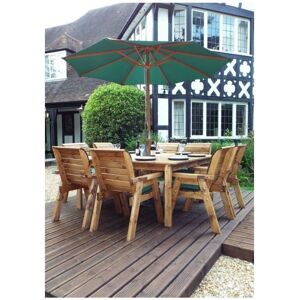 This item will be assembled by the Charles Taylor professional delivery team upon arrival. The dining set is perfect for gardens and outdoor spaces to enjoy some or alfresco dining in the sunshine with friends and family. Featuring eight wooden arm chairs and a dining table. The ample size means you could comfortably seat 8 people. This stylish set is perfect for any occasion, or some alfresco dining. Whether you have a patio, balcony or acres of garden, this set will help you create a relaxed seating area. This set would suit any space, be that at the seaside, by the river, your country garden or an urban patio. Components can all be used separately for maximum versatility Includes: 8 x Armchairs1 x Dining Table1 x Green Parasol1 x Parasol Base8 x Green Seat Cushions1 x Cushion Storage Bag. To maintain freshness, it is best practice to store cushions indoors when not in use Delivery to the following postcodes will incur a surcharge, please contact us before ordering - KW & IV.