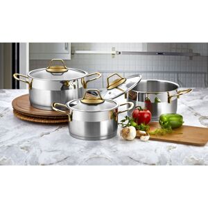 Produced from natural and durable materials 18/10, 304-grade Cr. Ni. stainless steel body with a thick capsule base for strength and durability offering great heat distribution with energy-efficient cooking Long-lasting mirror-polished finish Ergonomic and heat-resistant colour handles. Heat-resistant toughened glass lids with sturdy stainless steel rims for easy viewing For long-term use, in warm soapy water, rinse with a non-abrasive sponge and dry well. We recommend that you do not use metal utensils while preparing food and cleaning. Suitable for all hobs except induction Belfry Kitchen Colour: Silver/Gold