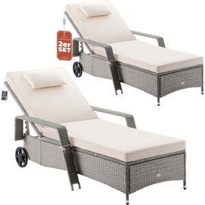 Maximum Reclining Comfort Transform your garden into a wellness oasis with the practical set of 2 sun loungers from CASARIA® and enjoy relaxing hours on the patio, balcony, or garden. The extra-thick 7cm cushion provides even more comfort. The cushions are water-repellent and UV-resistant. The lounger can support up to 165kg. Thanks to the smooth-running wheels, you can easily transport the garden lounger and move it flexibly with the sun. The headrest is adjustable in 5 positions, allowing you to easily adjust the backrest to your perfect lying or sitting position while reading. The headrest ensures a comfortable neck position. The sun lounger's hand-woven polyrattan and sturdy, powder-coated steel frame are designed for safety while also adding a stylish touch to your garden. Product Details: Extra-wide reclining surface High reclining comfort thanks to the 5-way adjustable backrest Easy transport thanks to smooth-rolling tires Sturdy, robust, powder-coated steel frame Hand-woven