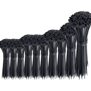 Package Content: 1000pcs nylon cable ties. Dimensions: 300pcs 100mm × 3mm, 300pcs 150mm × 3mm, 200pcs 200 × 4mm, 100pcs 250mm × 4mm, 100pcs 300mm × 4mm (Tensile Strength: 8.1-18kg) Black Material: Durable and strong nylon 6/6 UV protected Ideal for: commercial use, DIY, cable management, special events, workshop, office, packaging or garden.