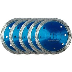5 super thin 105mm diamond cutting discs. Suitable for dry and wet cutting. Diameter 4"/105mm, segment height 10mm, thickness segment size 1.2mm, bore: 22.23mm/7/8" Reinforced steel core prevents bending, wobbling and vibration during cutting. < p>Suitable for cutting very hard materials: porcelain, granite, marble, concrete, sandstone, tiles, soft and ordinary building materials, etc.