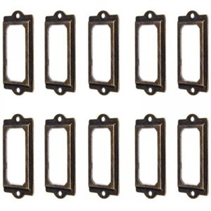 Material: Iron label holder, antique bronze finish, sturdy and durable, with antique design. Package Content: 50pcs label holders to meet your needs. Dimensions: 59.4 × 17.2 mm, please allow 1-3 variations mm due to manual measurement. Color: Bronze Easy to Install: The label holders can be easily fixed on wooden surfaces with the small screws provided, with two screws per label holder, you can easily install them at home. Wide Range of Applications: The metal label holders are widely used in drawers, bookcases, shelves, jewelry boxes, gift boxes, lockers, cabinets, document holders, etc.