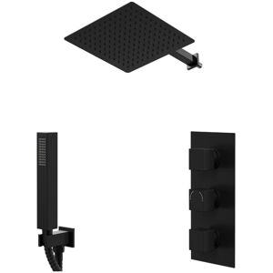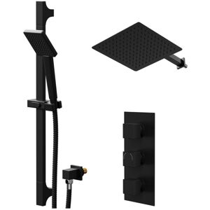 Model Number: WDB12023 Our Colore Square Matt Black Concealed Square Triple Thermostatic Shower Valve makes a real style statement and delivers durability and affordability. Under the sleek surface the solid brass body gives you total control over both an overhead shower rose and a slide rail kit. Chic and contemporary with a gorgeous matte black finish and square design this shower valve will compliment any classic or modern bathroom. The WRAS approved materials and thermostatic feature offer complete peace of mind and assure a safe and satisfying showering experience. Use the centre control to set your perfect temperature and the top and bottom dials to adjust the water flow to their respective outlets and shower accessories. Key features Thermostatic technology Stylish matte black finish Concealed brass valve 100mm depth required for installation