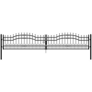 This high-quality, stylish fence gate is powder-coated to protect against rust and corrosion, which makes it an ideal entry point for the fence around your garden or patio. Durable material: Manufactured from powder-coated steel, the garden gate is exceedingly stable, sturdy, and durable. High-security design: The gate provides a high degree of security with its elegant, arched top design and strong horizontal braces to reinforce the frame while forming a stunning entryway to your property. Quick locking: A heavy-duty locking system with 3 matching keys ensures extra security and safety for your yard. Note: Each product comes with an assembly manual in the box for easy assembly. Colour: Black Material: Powder-coated steel Overall size: 406 x 120 cm (W x H) Single door size: 191 x 75 cm (W x H) Post height: 110 cm Mounting materials included SKU: 151099 EU responsible party Haba Trading B.V. Mary Kingsleystraat 1 5928SK Venlo The Netherlands Compliance-safety@vidaxl.com
