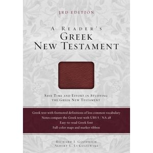 A Reader’s Greek New Testament: Third Edition saves time and effort in studying the Greek New Testament.If a Greek word appears in the New Testament fewer than 30 times, then a definition is provided.This serves as an aid when you encounter less common vocabulary, allowing you to focus on reading, comprehension, parsing, and grammatical issues.You no longer have to interrupt your reading, searching through a lexicon!Featuring a handsome Italian Duo-Tone™ binding, A Reader’s Greek New Testament: Third Edition is a practical, attractive, and surprisingly affordable resource. Features of this third edition include: footnoted definitions of all words occurring 30 times or less; mini-lexicon of all words occurring more than 30 times; Greek text underlying the New International Version; footnotes comparing the Greek text with the critical text of UBS5/NA28; 4 pages of full-color maps; marker ribbon; and easy-to-read Greek fonts.