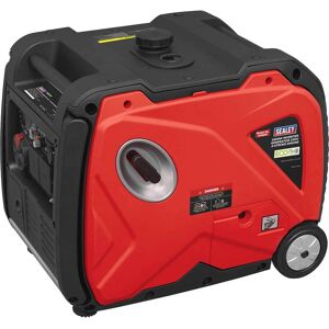 Digital inverter technology provides pure sine wave electric power suitable for use with sensitive electrical equipment. Easily moveable with folded handle and sturdy wheels making it portable once on site. Eco mode set-up allowing the generator to run quieter (73dB LPA), increase fuel efficiency (8L fuel tank) and reduce emissions. Features both pull cord and switch start, auto voltage adjuster, fuel gauge sensor, electric circuit protector and ESC smart control allowing the speed of the engine. Fitted with two 13A sockets, 12V DC 8.3A port and 2 USB charging ports. Supplied with tool kit to access battery, funnel, connector and clips which can charge a 12V car battery. Features & Benefits: • Digital inverter technology provides pure sine wave electric power suitable for use with sensitive electrical equipment. • Easily moveable with folded handle and sturdy wheels making it portable once on site. • Eco mode set-up allowing the generator to run quieter (73dB LPA), increase fuel efficiency (8L fuel tank) and reduce emissions. • Features both pull cord and switch start, auto voltage adjuster, fuel gauge sensor, electric circuit protection and ESC smart control allowing the speed of the engine. • Fitted with two 13A sockets, 12V DC 8.3A port and 2 USB charging ports. • Supplied with tool kit to access battery, funnel, connector and clips which can charge a 12V car battery. • Overall Size (W x D x H): 590 x 456 x 511mm. • Model No. G3500I Specifications: Model No G3500I Brand: Sealey Continuous Power Rating: 3200W Current Rating: 13.9A Dimensions (W x D x H): 590 x 456 x 511mm Fuel Tank: 8.3L Fuel: Unleaded Petrol Maximum Power Rating: 3.5kW Maximum Running Time: Rated Load- 5±0.5hrs 50% load - 8.5±0.5hrs Motor Power: 4.1KW/3600rpm Motor Type: 4-Stroke Petrol Nett Weight: 44.3KG Noise Rating: 73dB(LPA) Output: 230V-50Hz/ 12V DC/ 5V USB