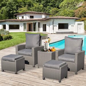 Sit back and relax in complete comfort with this rattan chair and stool set. Formed of five pieces, the set includes two reclining armchairs, two footstools and a matching coffee table. Made from hand PE rattan with an aluminium frame, each piece is sturdy, weather-resistant and low maintenance. The table comes with an inner cooler to keep food and drink fresh and away from pests. The cushions ensure comfort for long periods. Each piece is finished with adjustable feet for balance. Marlow Home Co.