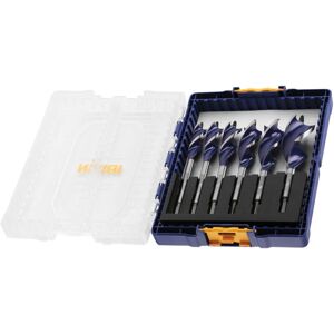 Description These are high-quality Blue Groove 6X wood drill bits designed for fast and precise drilling in all types of wood. They feature a spiral design with a hexagonal shank for a secure grip and easy handling. The bits produce clean, accurate holes with minimal splintering and are fully hardened for durability. Their triple conical spiral allows for quick chip removal, reducing binding and increasing efficiency. The drill bits are equipped with a screw tip for easy centering and smooth operation. Technical Specifications Set includes drill bits with diameters: 16mm, 18mm, 20mm, 22mm, 25mm, and 32mm Length: 165mm Material: Fully hardened steel Design: Spiral with triple conical flute Shank: Hexagonal for secure grip Compatibility and Accessories Compatible with standard drill chucks Suitable for use with electric drills and cordless drills Installation Insert the drill bit into the drill chuck and tighten securely Select the appropriate size for your project Usage Use in